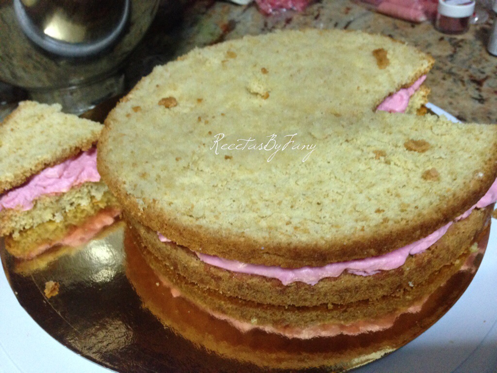 Primera capa de bizcocho, pasamos el almíbar sobre él, y ponemos la capa de nata; otra capa de bizcocho, almíbar y una capa de trufa, y por último cubro toda la tarta. Para decorar con otros colores solo queda mezclar un poco de nata que vayamos a usar con el colorante en gel o crema que queramos. En el vídeo podéis ver cómo la decoro o en las fotos, pero esto ya va a gustos!