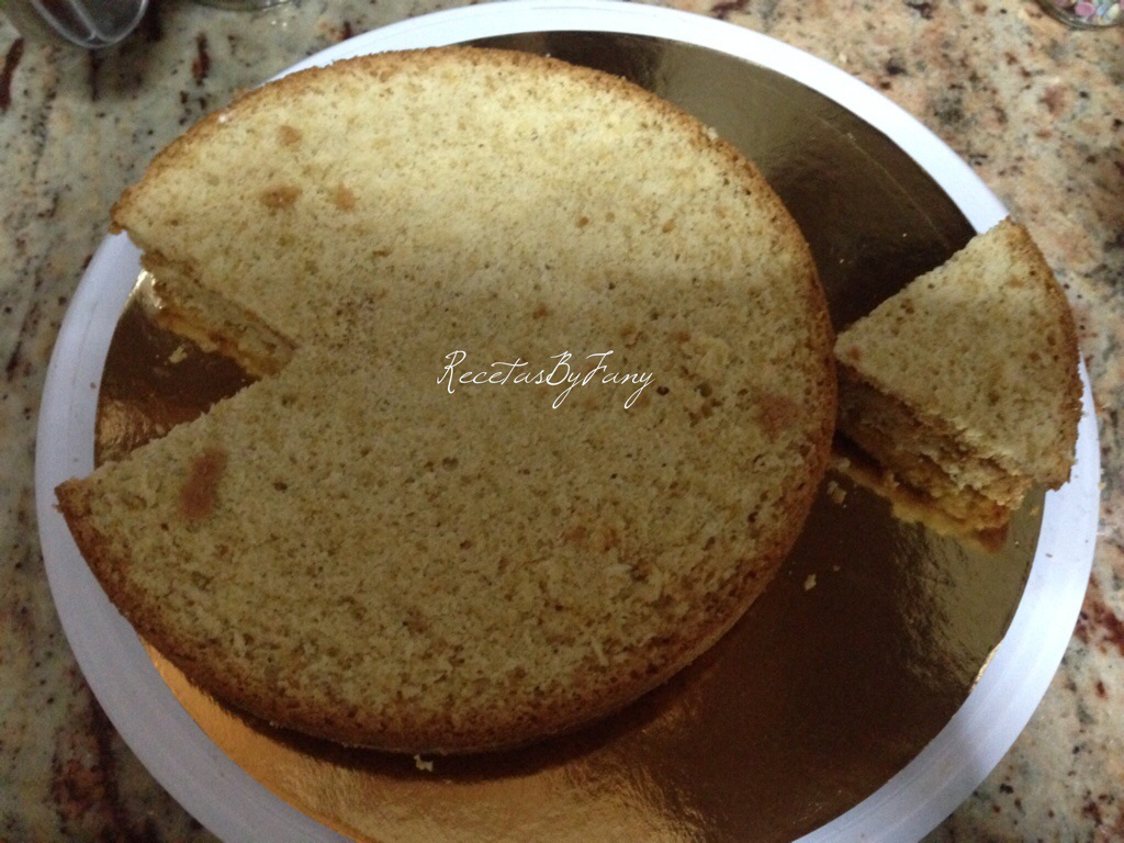Dejamos enfriar un poco, delmoldamos y cortamos en 3 capas el bizcocho, para formar nuestras 3 partes de bizcocho de la tarta.