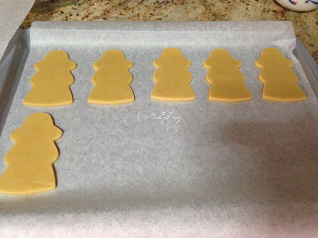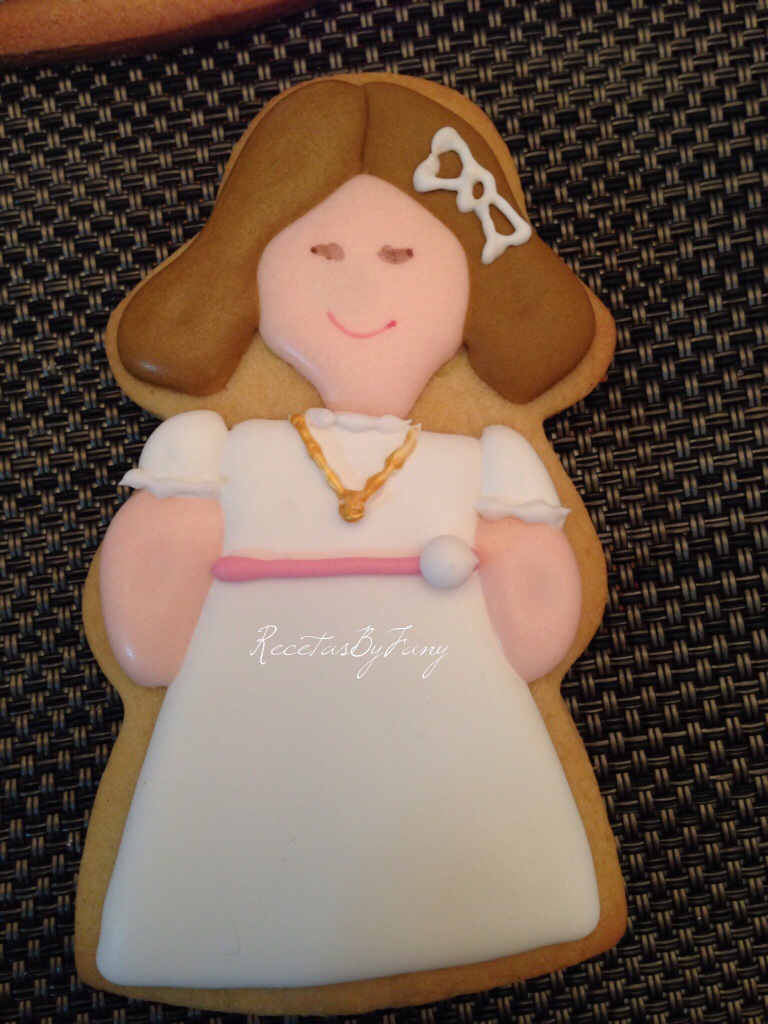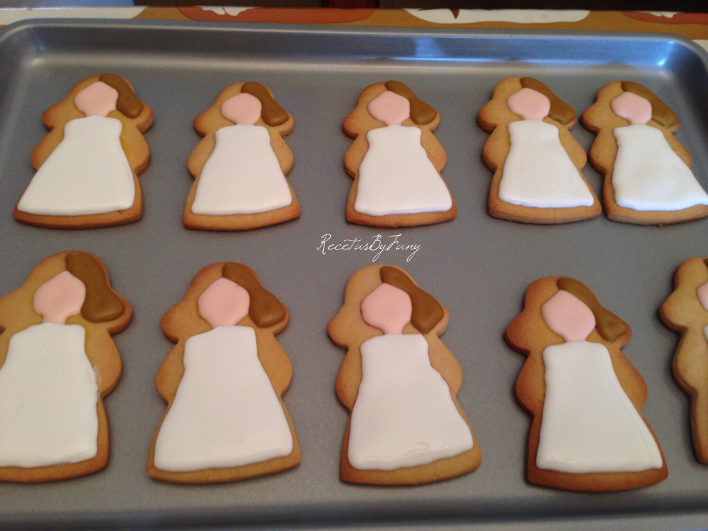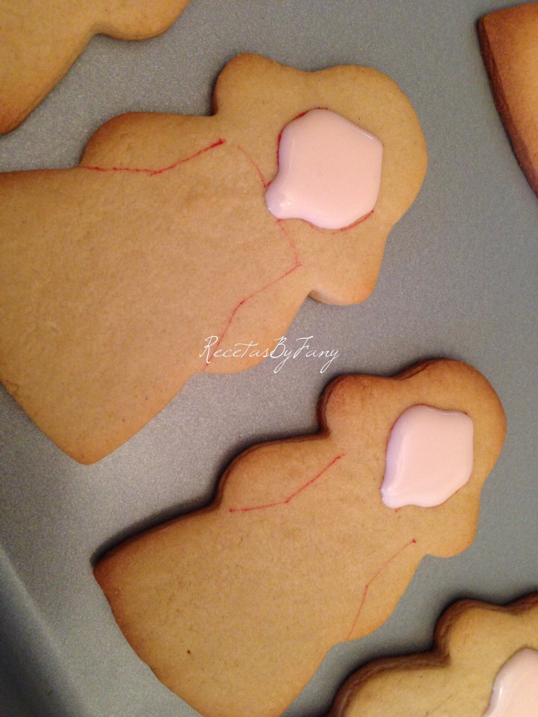 Bueno, vamos a la obra… Tanto la masa como la glasa son la misma que hice en la receta de las galletitas de comunión: https://recetasbyfany.com/2014/05/21/galletas-de-munecas-de-comunion-con-glasa/. Pero ésta vez el sabor de las galletas en vez de ser de caramelo como la otra vez las he hecho de vainilla.