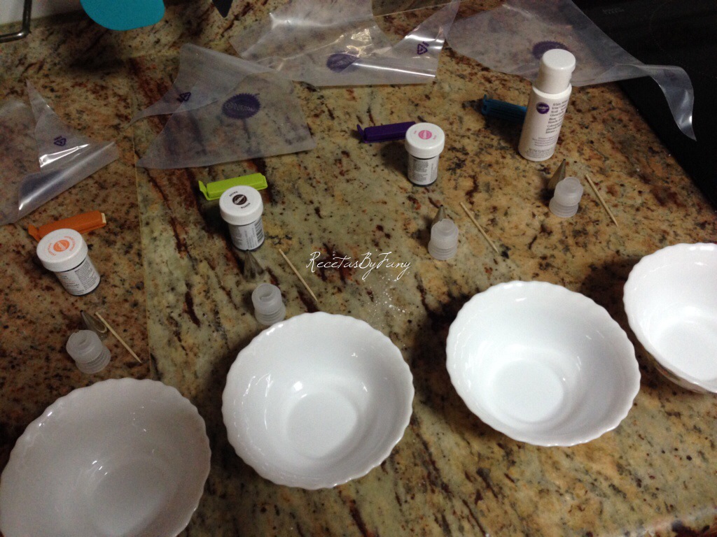 Colocamos cada glasa en cada manga o biberón o lo que queramos usar, yo he usado esta vez sólo mangas, boquillas y un palillo en cada punta de cada boquilla para que no se seque la glasa entre uso y uso. Por la parte superior de la manga he colocado un palillo que deja la bolsa hermética (de estas de ikea)… Y a disfrutar decorando!! Yo creía que me iba a atacar y iba a mandar las galletas bien lejos, pero.. me relaja decorar galletas!!