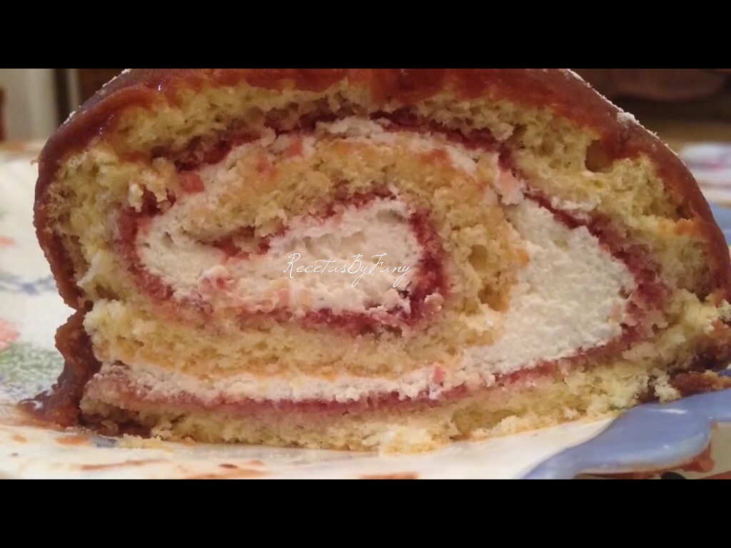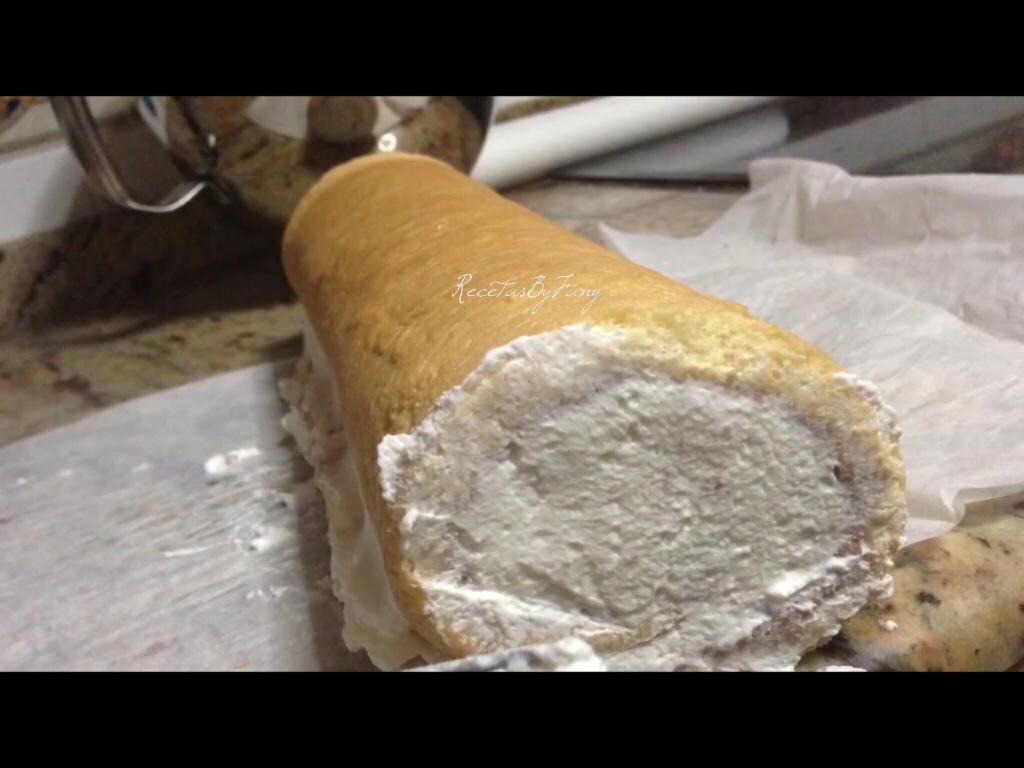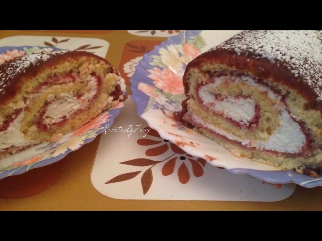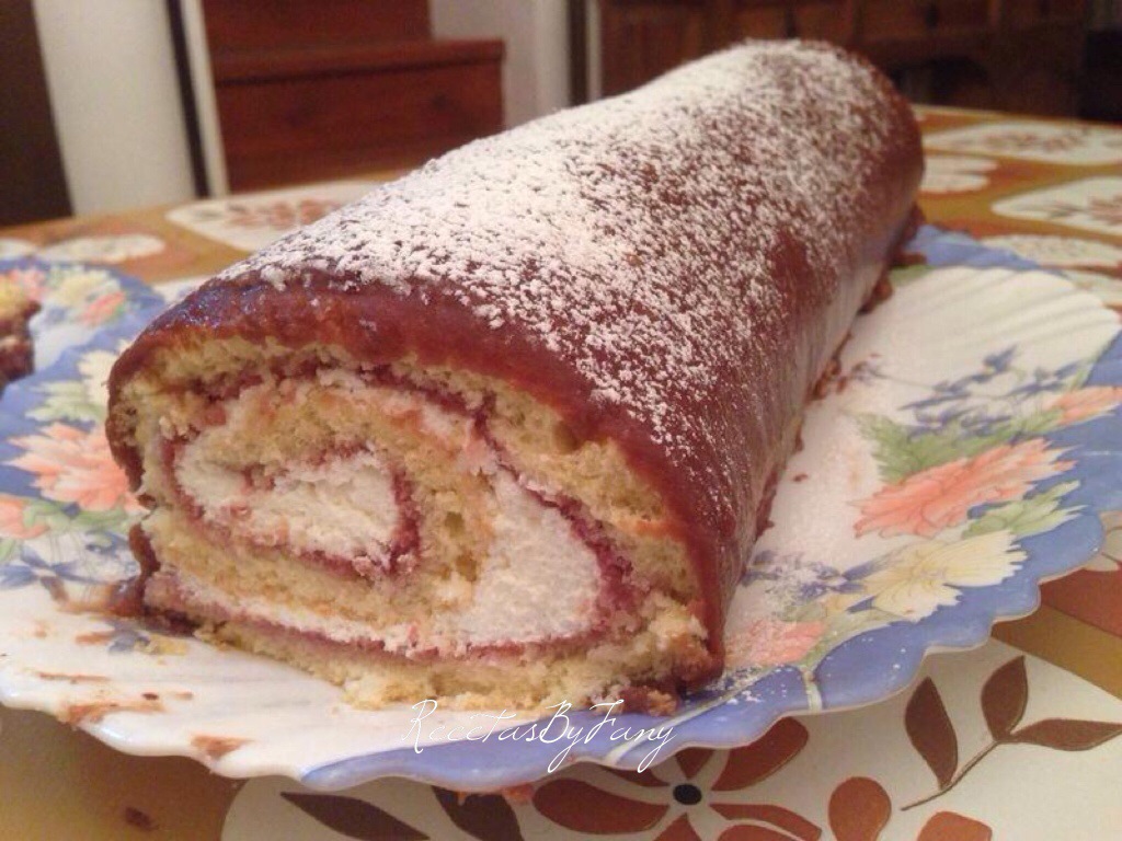 Abrimos el bizcocho enrollado y untamos sobre él la crema recién hecha, volvemos a enrollar ahora sobre sí mismo el bizcocho con el relleno y dejamos enfriar en la nevera un mínimo de 1 hora.