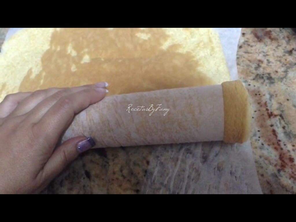 Una vez sacamos del horno, ponemos boca abajo sobre otro papel de hornear nuevo y quitamos con cuidado el papel de hornear que ha quedado pegado al bizcocho. Enrollamos el bizcocho sobre este papel de hornear nuevo y dejamos enfriar así en esta posición.