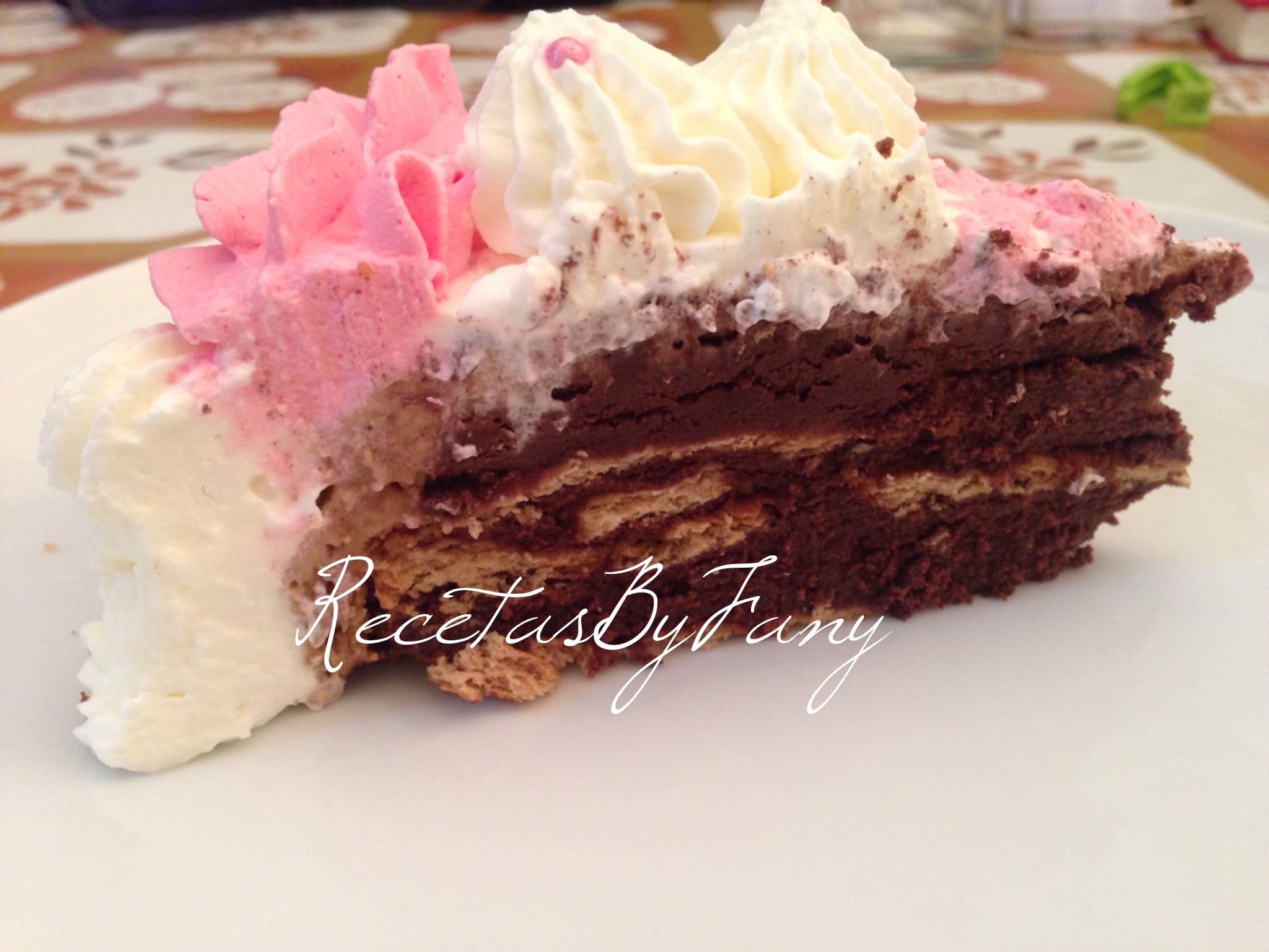 Para montar la tarta (podéis ver mejor vídeo explicativo) colocamos un poco de nata o alguna de las cremas en la base para que no se nos mueva, y colocamos encima el primer bizcocho. Echamos por encima del primer bizcocho almíbar al gusto para que quede jugoso y untamos la primera capa con la crema de kinder; otra capa de bizcocho bañado en almíbar y otra capa de crema de chocolate blanco y una última capa de bizcocho también bañado en almíbar.
