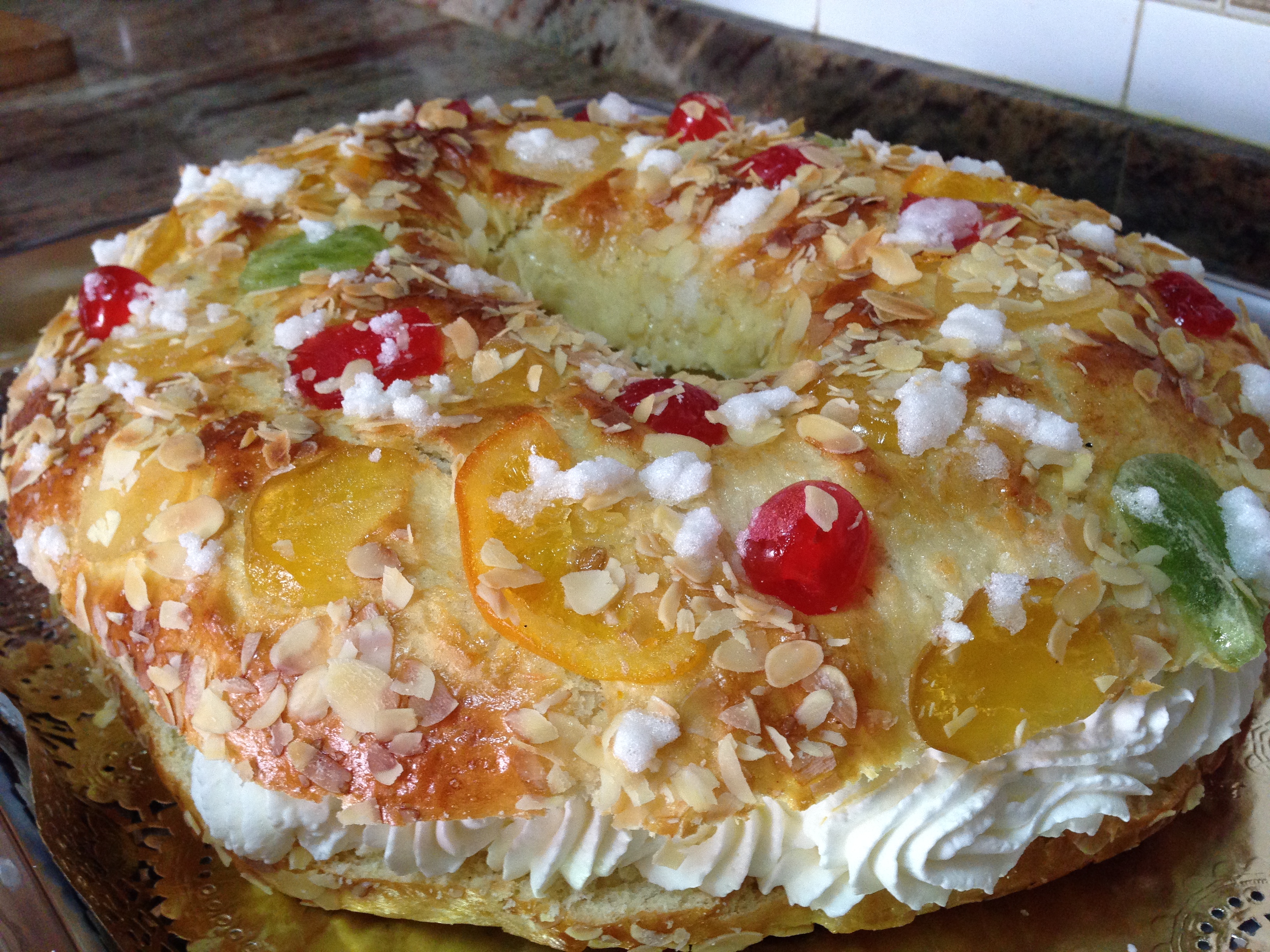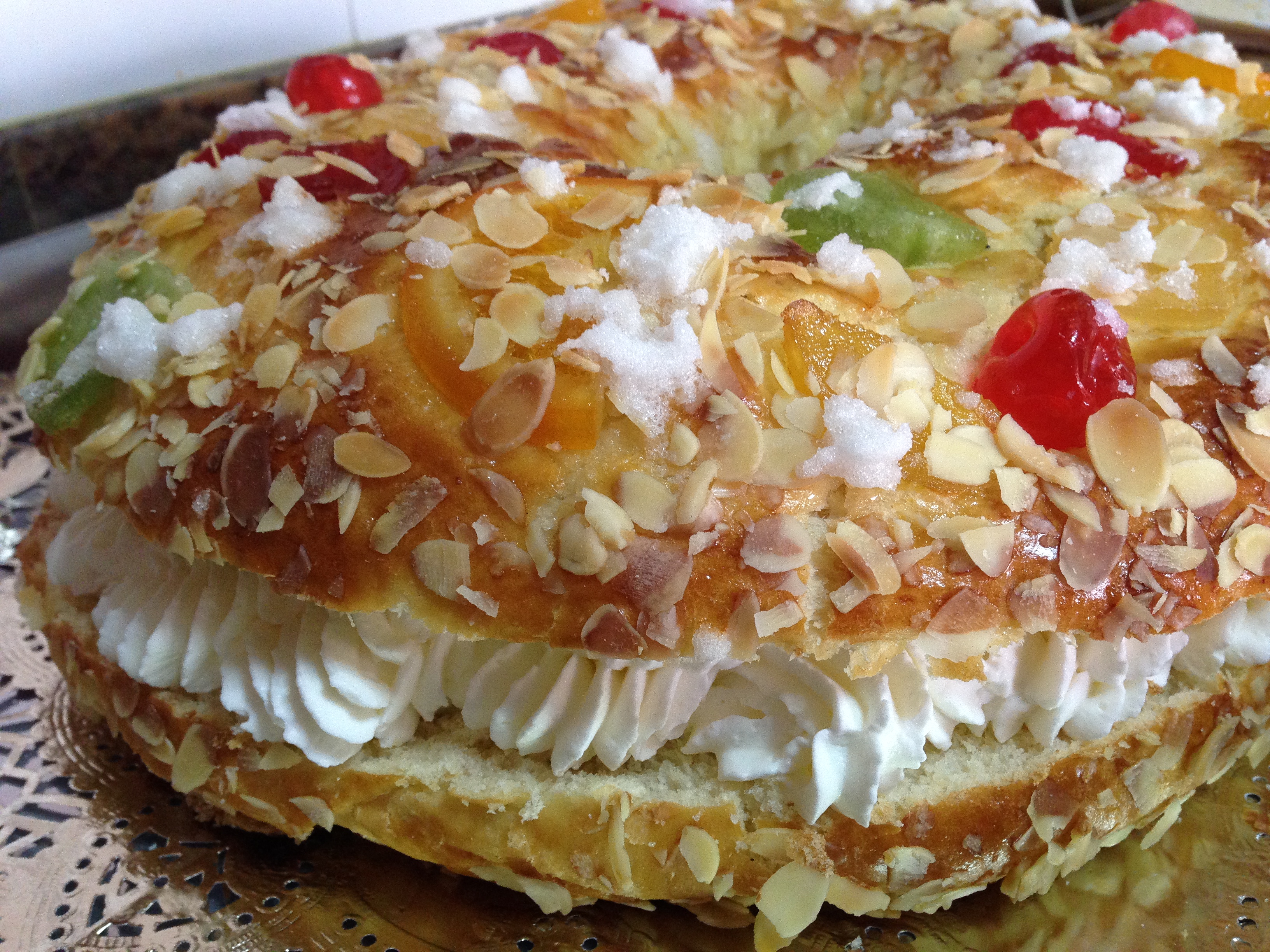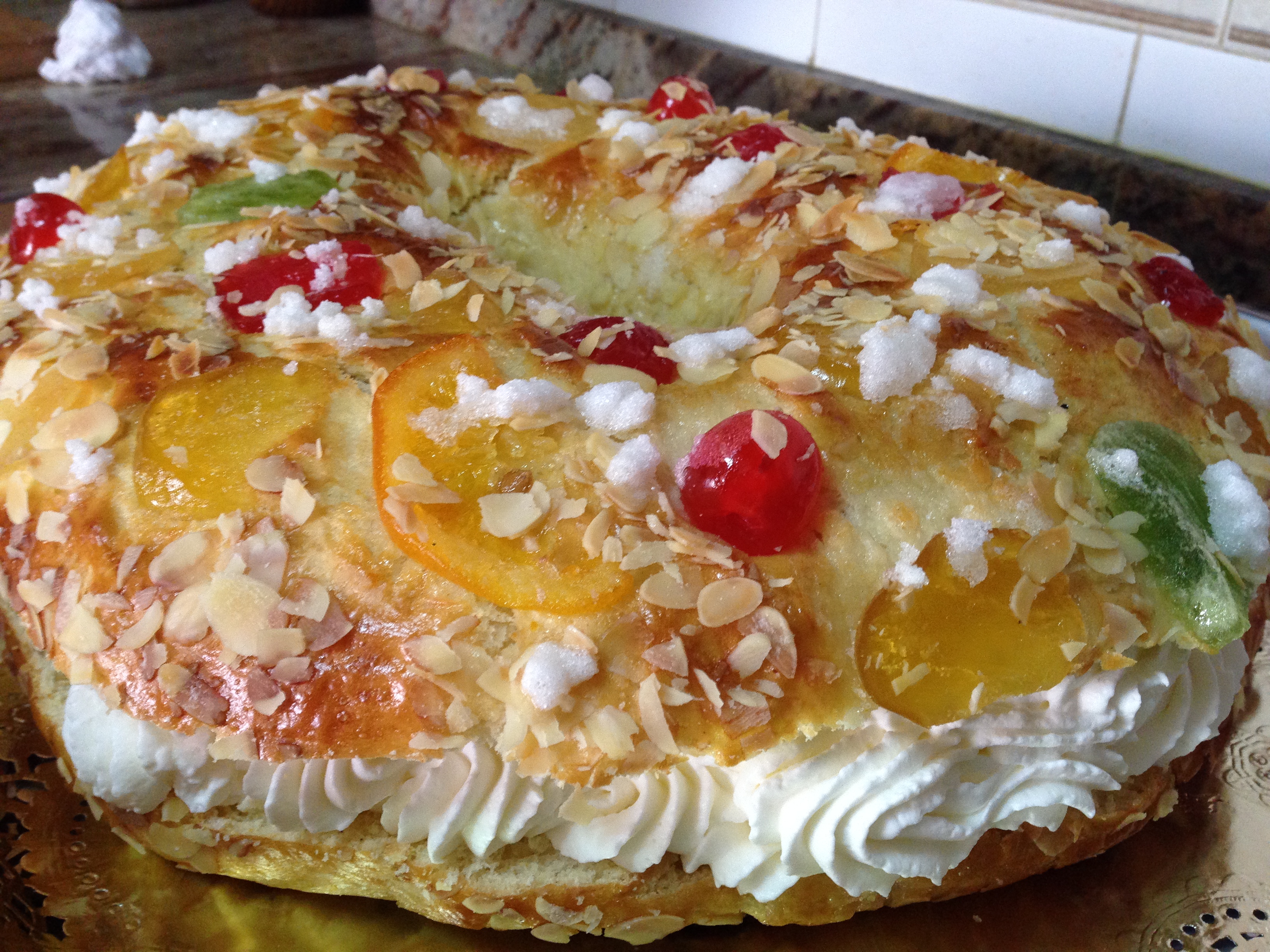 Pasada la hora volvemos a pintarlo con huevo y lo decoramos con bastante fruta escarchada y abundante almendra laminada. Además cogemos el azúcar con unas gotitas de agua y lo echamos por encima del roscón como nieve. Y ya introducimos el roscón al horno, que estará precalentado a 200 grados con calor arriba y abajo sin ventilador, y una vez introducimos en él el roscón bajamos la temperatura a 180 grados. Se horneará unos 20-22 minutos o hasta que se dore. Preparamos una rejilla de horno para dejarlo enfriar ahí. Una vez frío lo partimos por la mitar con un cuchillo de sierra para rellenarlo de nata después. O lo dejamos así si nos gusta mas el roscón sin relleno, pero con la nata queda increíble…